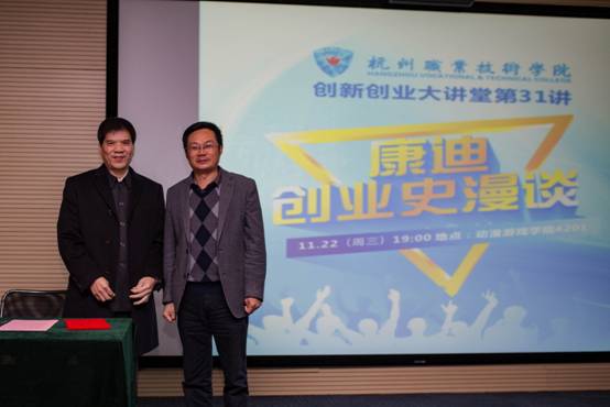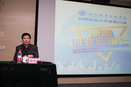 随后胡董从谈党的十九大报告感受开始,回忆了毛泽东主席关于资本主义必然失败,社会主义必然胜利的论断,分析了供给侧计划经济与需求侧计划经济的区别,称赞了新时代中国特色社会主义日新月异的进步,他回顾康迪电动汽车集团33载创业发展历史,1984年创办永康微型轿车厂,1985年5月6日我国首辆微型轿车在永康微型轿车厂面世,到开创“微公交”新能源汽车分时租赁模式,风雨兼程30多年,期间有成功、有失败。胡董以一个企业家的坚韧和毅力,为完成自己的梦想,一直坚持着。他从创业大环境、核心团队形成、机会挖掘等方面分享了自己的创业历程,以“追梦、逐梦”为核心讲述了康迪的创业道路,彰显了一名企业家的情怀和社会责任感。胡董建议同学们用顽强的毅力迎接挑战,用坚忍不拔的精神迎接困难,用积极乐观的态度迎接未来,踏实肯干实现自己的创业梦想。