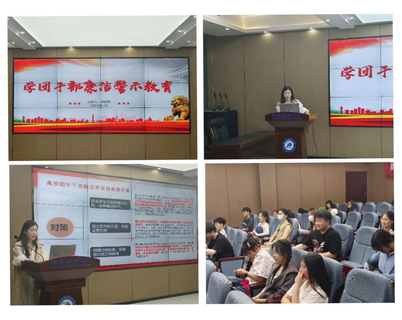 为了加强团总支学生会干部队伍建设,塑造清新阳光的团总支学生会组织形象。学工办李剑桥老师于5月18日在8306数字商贸培训中心开展了学团干部廉洁警示教育,参与此次讲座的有团总支学生干部及大一、大二全体团支书。