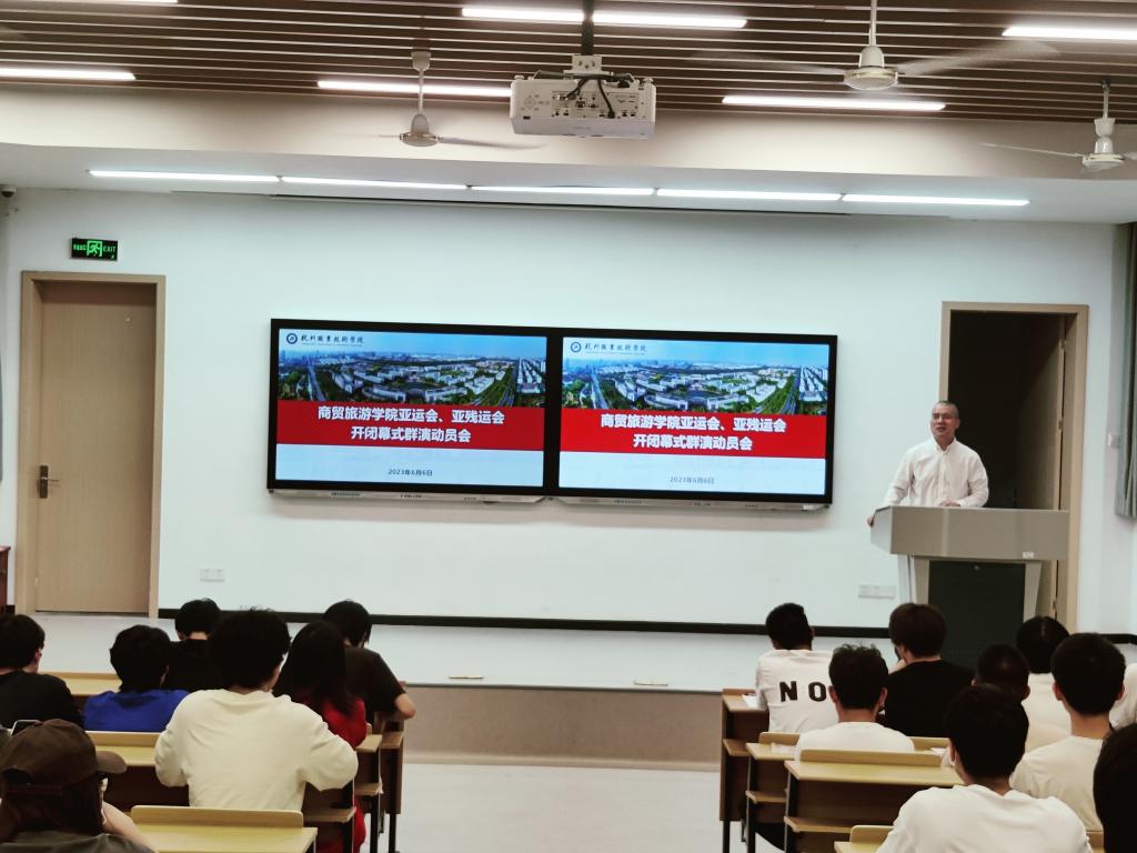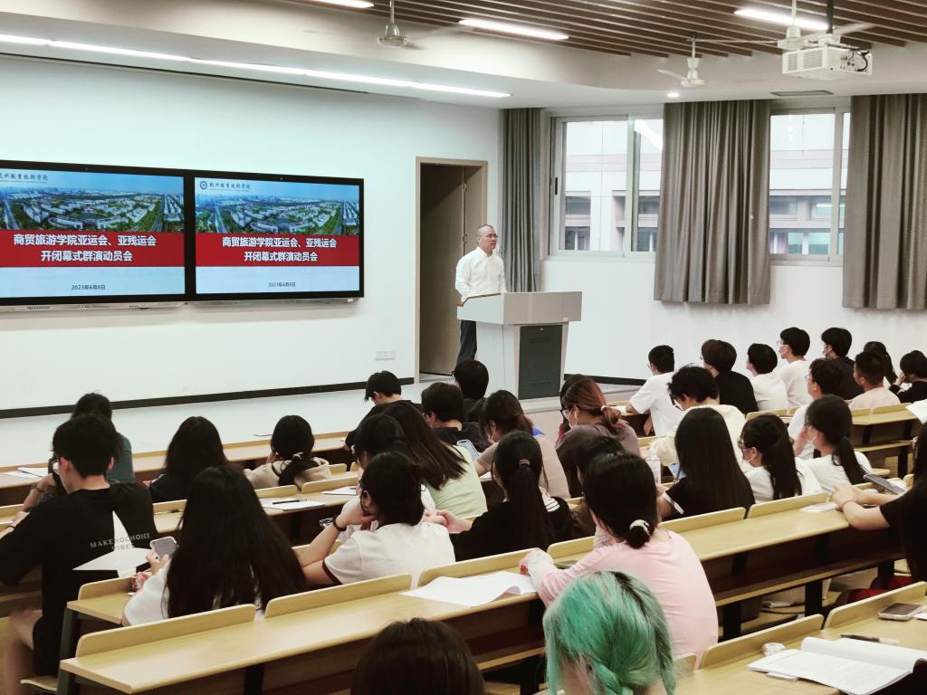 在杭州亚(残)运会倒计时110天之际,6月6日晚,商贸旅游学院在5201教室举行杭州亚(残)运会开幕式大学生群演动员会。商贸旅游学院党总支副书记周佳良,学工办王晓磊、郭明瑜及149名商贸学生群演出席。