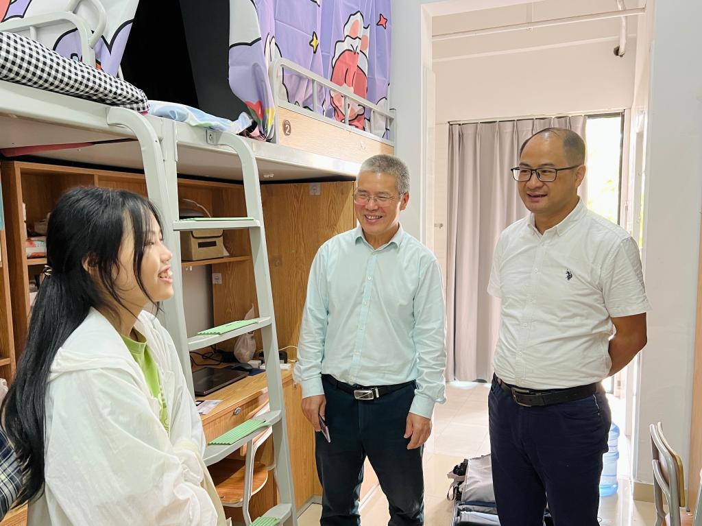 走访过程中,张赵根一行欢迎新生们的到来,关切询问新生家乡所在地、对学校的印象以及专业选择与规划,深入了解新生们普遍关注的问题,聆听他们对学校的意见建议,令新生倍感暖心。周佳良则鼓励同学们尽快适应校园生活,融入大学生活,脚踏实地、刻苦学习,努力成为堪当民族复兴重任的时代新人。