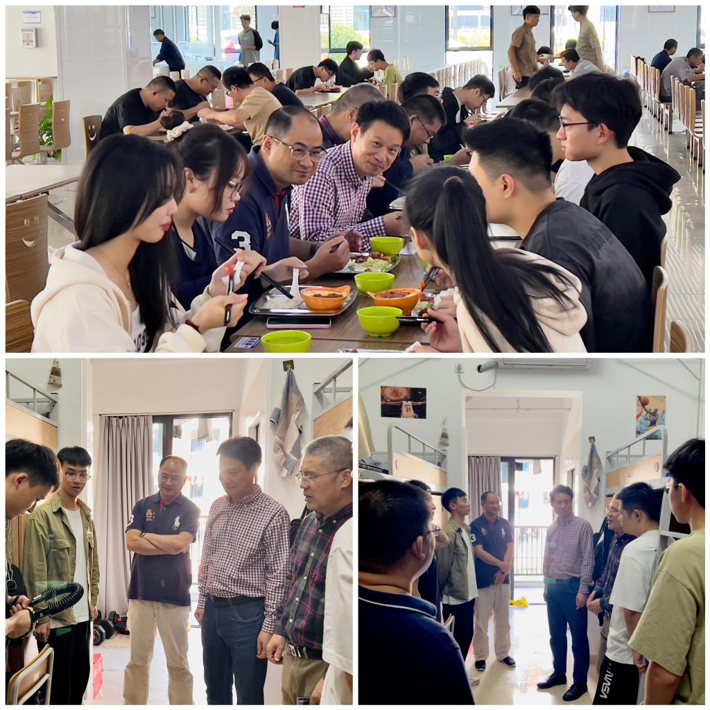 午餐会氛围轻松活跃,高云飞一行向参加群演学生的辛苦付出表示肯定与鼓励,并亲切询问了群演学生,了解学生排练期间和当前生活学习情况,倾听同学们分享学生训练感受和排练趣事。张赵根赞赏了群演学生们的奉献精神和积极向上的态度,强调了参与本次盛会表演价值和意义,并希望同学们把亚(残)运会精神辐射给更多的商贸学子。随后高云飞和商贸班子成员走访了学生寝室。在寝室高云飞查看学生居住环境,了解学生日常阅读书籍,为学生职业发展提出意见。周佳良和袁江军则表示勉励各位群演学生能把排练中的吃苦精神发挥到日常学习生活中来,在后续的学业舞台上也能大放异彩。
