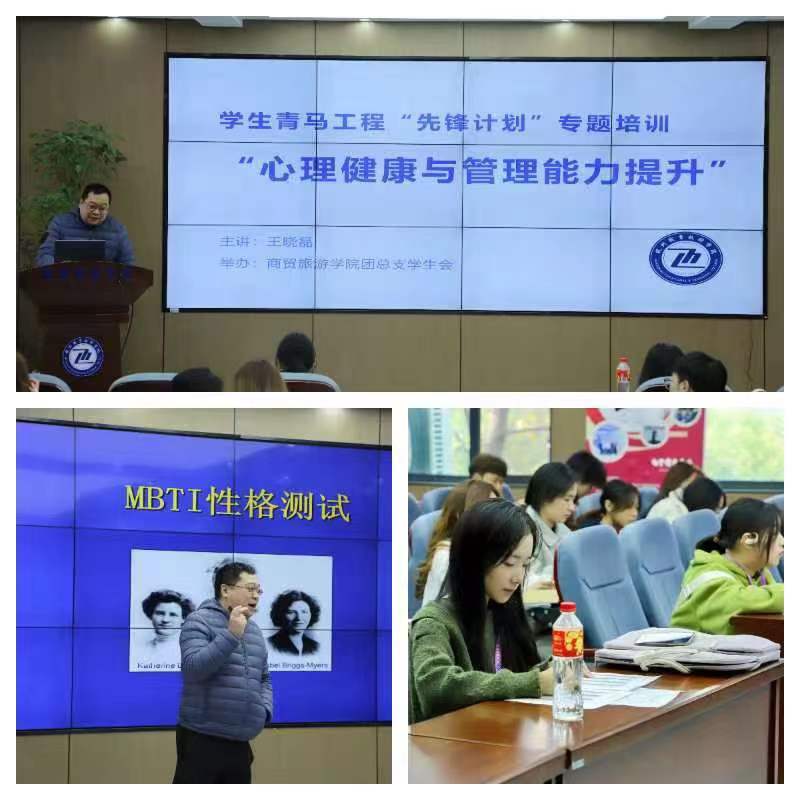 11月15日下午,商贸旅游学院团总支在数字商贸培训中心举办了主题为“心理健康与管理能力提升”的青马工程“先锋计划”专题培训,商贸旅游学院学工办王晓磊老师为学生干部作专题讲座,30多名学生干部参加。讲座由团总支副书记李志强主持。