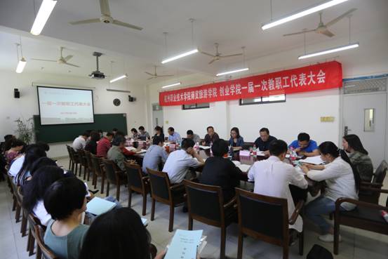 5月10日下午,商贸旅游学院、创业学院以“凝心聚力抓内涵、主动作为谋发展”为主题召开了一届一次教职工代表大会,共有28名正式代表和7名列席代表参加了本次会议。纪委书记陈泉淼、校工会副主席付文军受邀出席会议,分工会主席段勇主持会议。