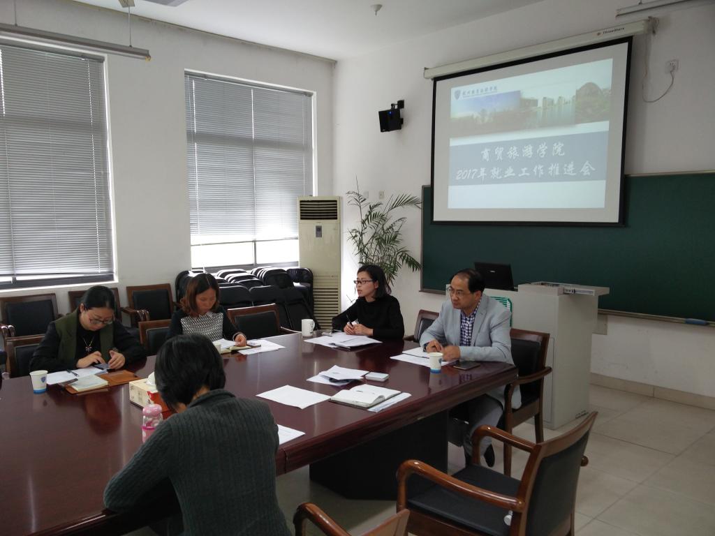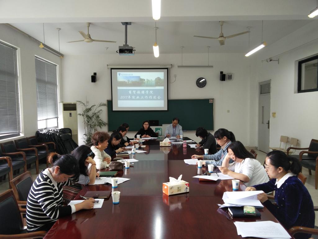 ,商贸旅游学院在8318会议室召开了2017届毕业生就业推进会。院长张赵根、党总支副书记王天红、大三年级辅导员陈玉燕和各毕业班班主任参加此次会议,学工办主任王晓磊主持会议。