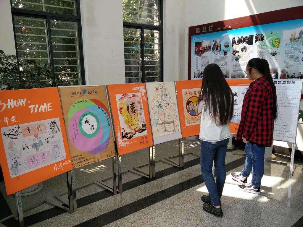 在诚信主题班会观摩活动举行的同时,另外一个诚信主题教育活动也在8号教学楼前厅开展。这就是诚信主题海报展。前期分院学生会宣传部组织分院各年级班级制作以“诚信跑步,诚信考试,诚信上课,诚信作业”为内容的海报制作评比活动,最终选出了各个奖项。这次将优秀诚信海报作品展出,让全体学生再次接受“诚信教育”,营造“人人讲文明、处处守诚信”的文明和谐校园。