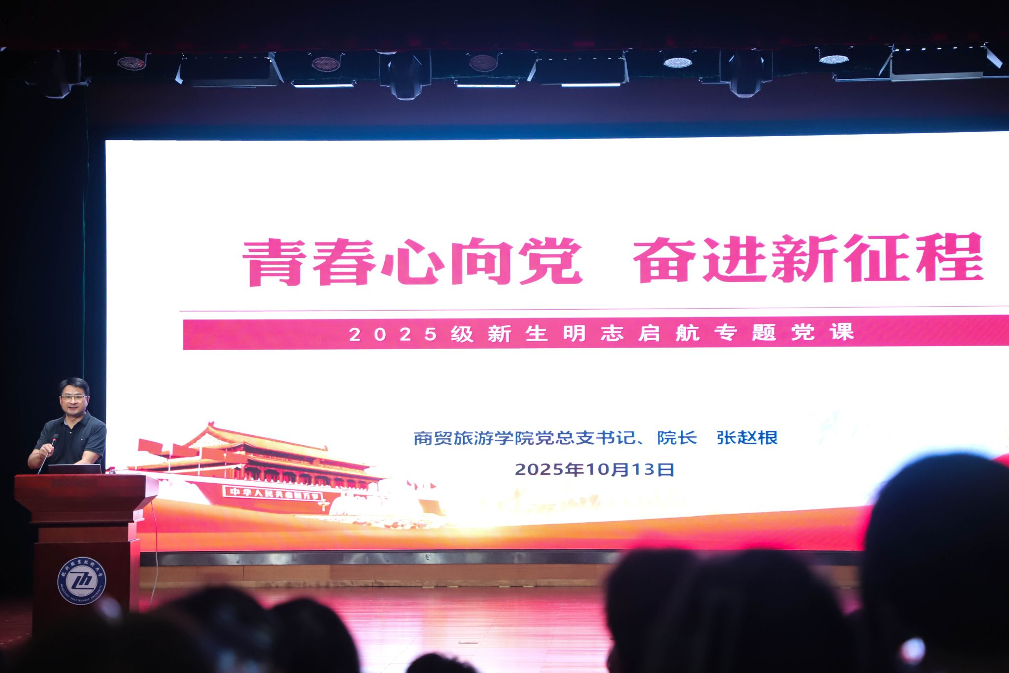为引导新生厚植家国情怀、勇担时代重任、明确大学方向,10月13日,商贸旅游学院党总支书记、院长张赵根为学院2025级新生带来一场兼具思想深度与育人温度的明志启航课,为初入校园的商贸学子们点亮成长灯塔。学工办主任王晓磊主持,辅导员郭明瑜、李迪可、2025级全体学生在场聆听。
