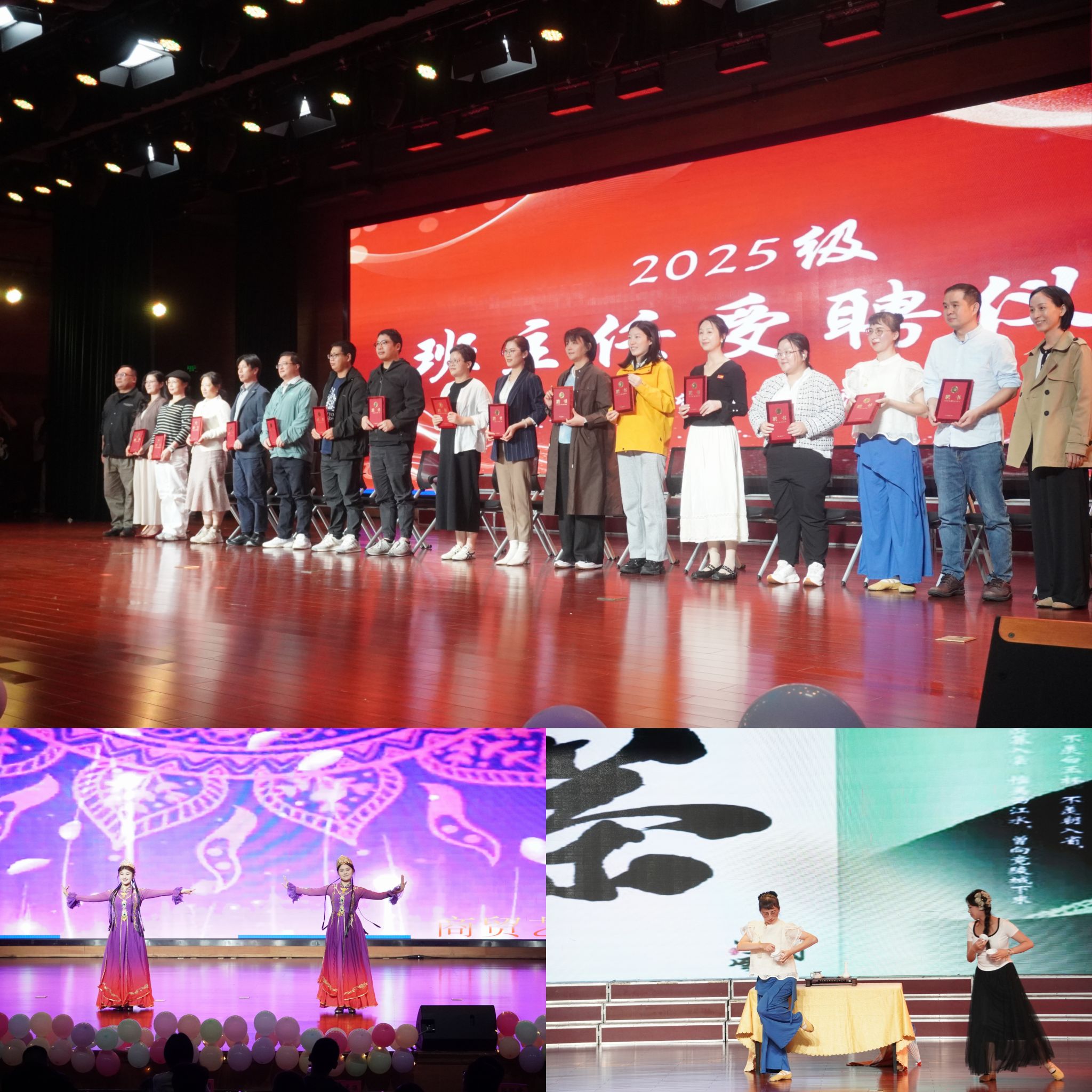 决赛现场不仅有歌声的碰撞,更有温情与互动的交融。活动中段,2025级新生班主任受聘仪式温馨举行。新生代表手捧热茶,依次向班主任敬茶,一杯杯热茶承载着学子的尊敬与信赖;班主任们双手接过聘书,聘书的重量既是身份的认可,更是立德树人的责任承诺。此外,贯穿全场的抽奖环节持续点燃现场氛围,幸运师生或分享参赛感悟,或参与红色知识问答,让比赛在紧张之余更添欢声笑语。