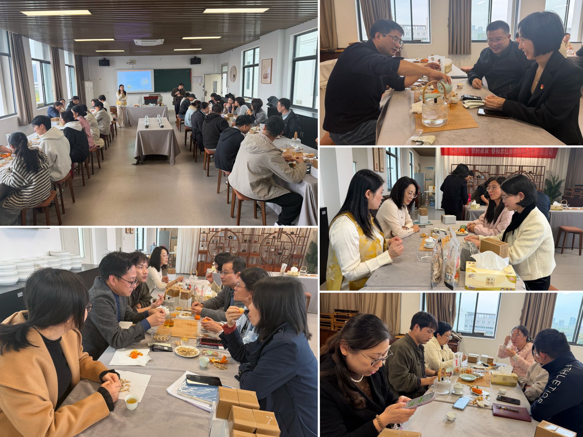 本次茶会邀请了高级茶艺师陈阳老师为大家带来《如何泡好一杯茶》的讲座,他从生活中常见的绿茶、红茶、乌龙茶等茶类入手,深入浅出地讲解了常见茶品的冲泡技巧,同时佐以亲身示范,让老师们直观学习了整个冲泡过程。本次活动所备茶品有妃子笑、桂花九曲红梅、老枞鸭屎香单丛、正山小种等,滋味鲜香、回甘悠长,均收到了会员们的赞赏。会员们自己组局,亲自实践了泡茶技巧,小组交流品茶,大家欢声笑语,为微寒秋日带来了温暖和温馨。在茶香袅袅的氤氲下,来自不同部门和院系的老师们不时交流工作、互加微信,相信在今后的日子里,将会以更好的精神状态投入岗位工作,为学校的职业本科大学建设做出新的更大贡献。