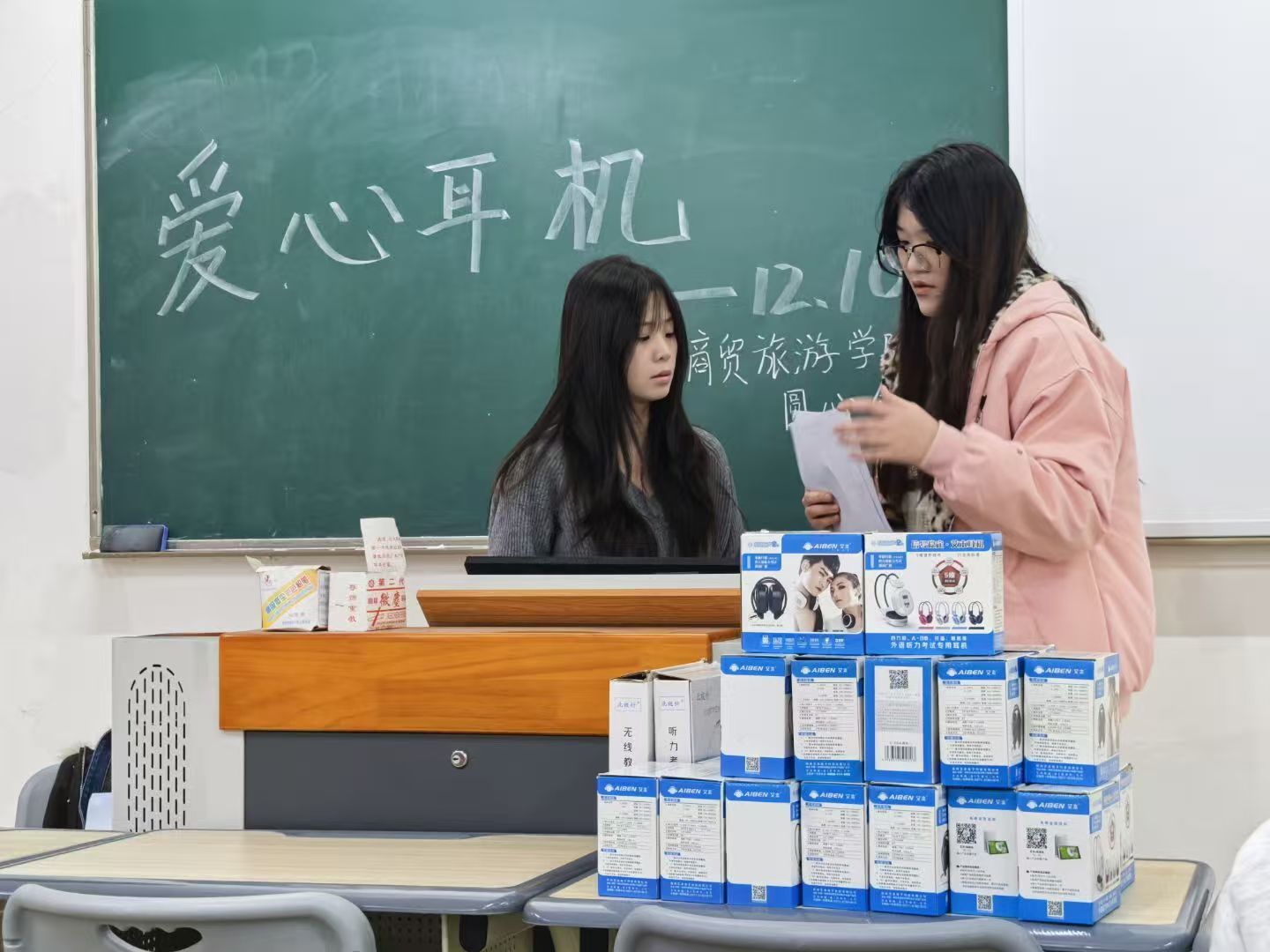 为保障受资助学生顺利参加大学英语四、六级考试,12月10日下午,商贸旅游学院助困社团圆心舍在8号楼组织开展了爱心耳机租借服务,为考生提供设备租借与现场调试支持。