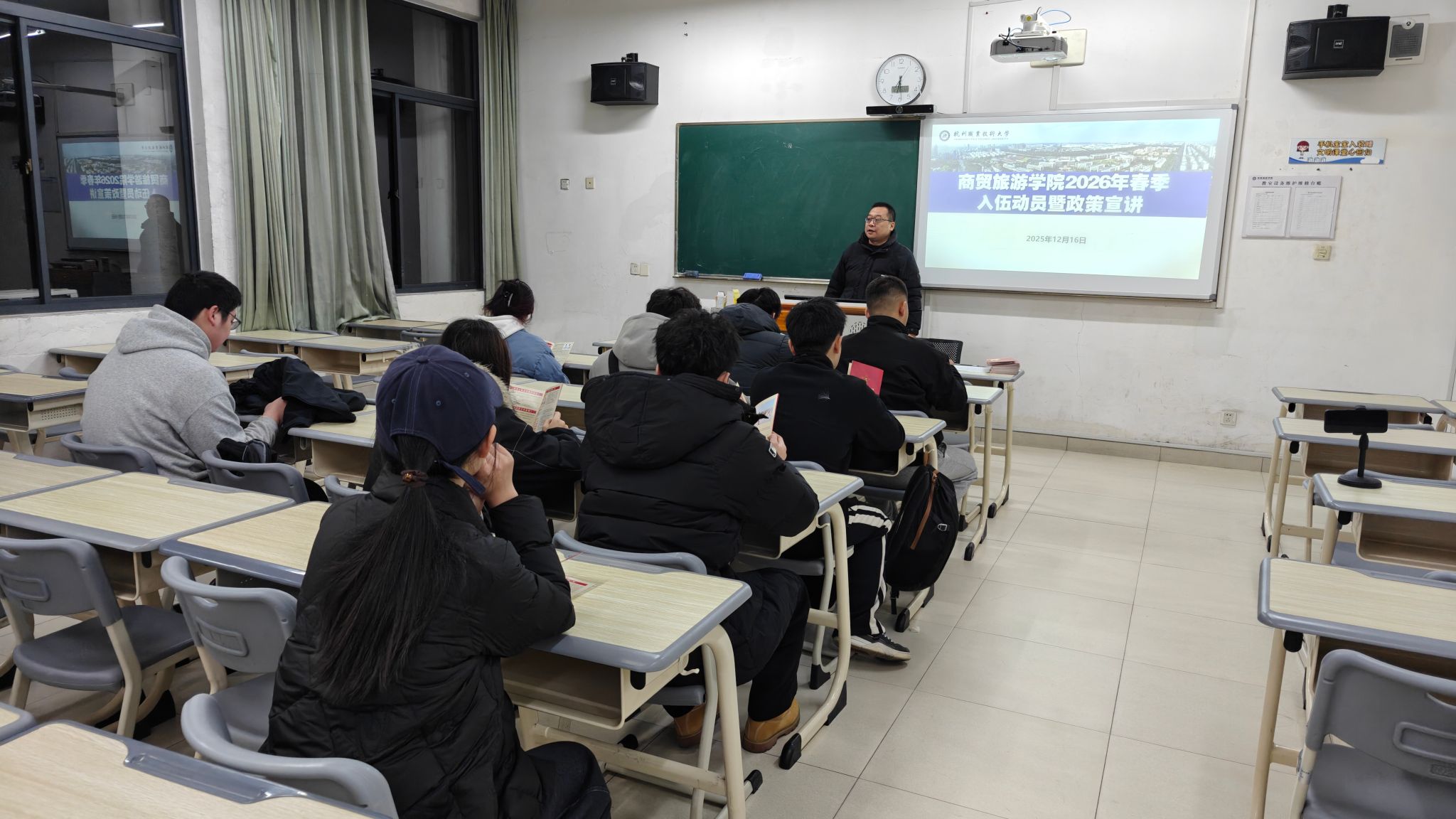 12月16日,商贸旅游学院组织召开2026年春季入伍工作征兵报名动员暨政策宣讲会。为兼顾在校学生与毕业班校外实习学生的需求,本次会议创新采用线下会场与线上直播同步进行的方式,确保政策宣传全覆盖、无遗漏。会议由学院学工办主任王晓磊主讲。