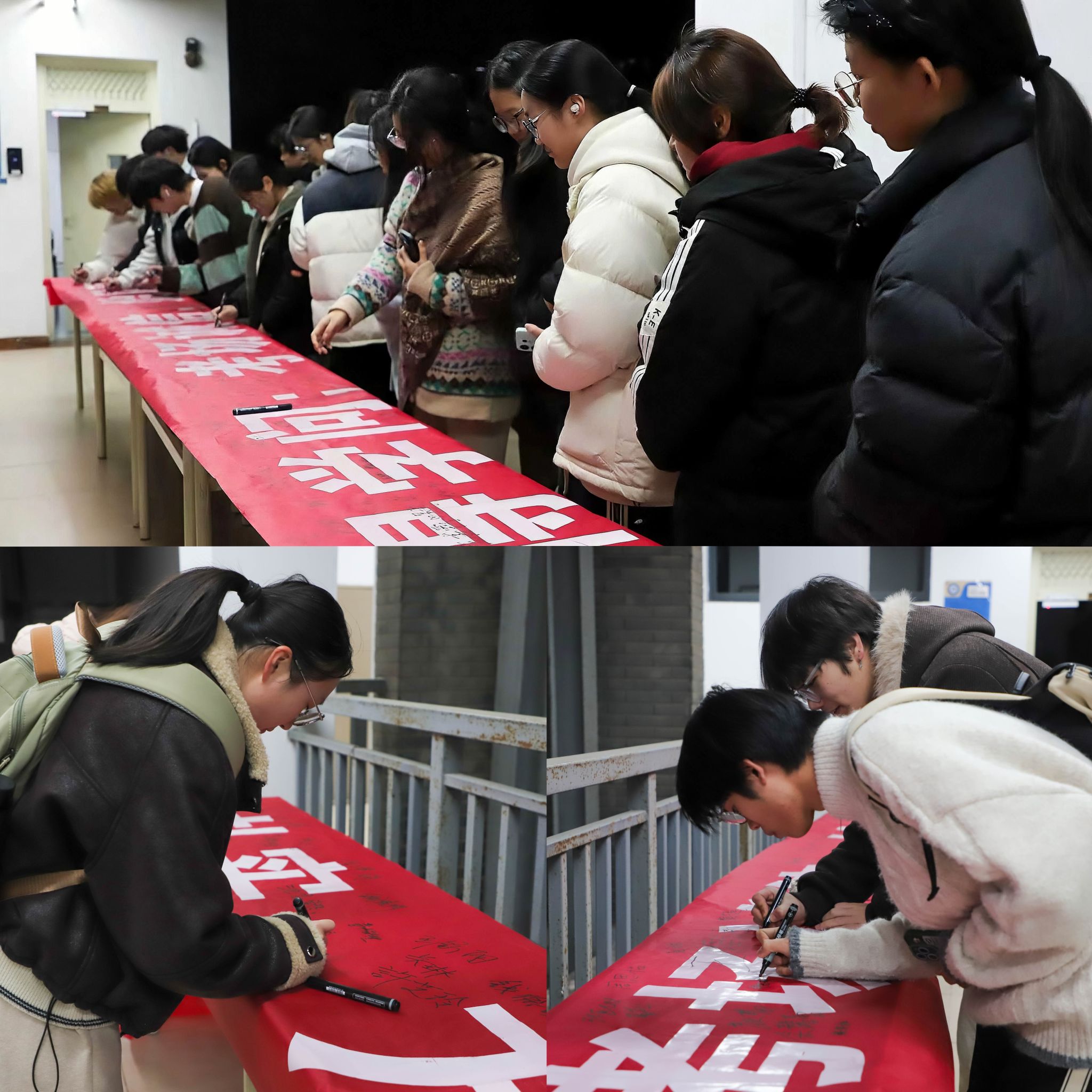 活动现场,“学风扎实,方得学问,考场诚信,始见真知”的红色横幅格外醒目,吸引众多学子驻足。大家有序排队,郑重签下名字。这一笔一划是诚信应考的宣誓,更是践行扎实学风的承诺——期末复习沉心钻研,考场之上坚守底线,以真实成绩检验成果,用诚信品格诠释担当。签名后各班级还利用晚自修开展诚信考风班会,进一步强化认识学习考试有关纪律要求。
