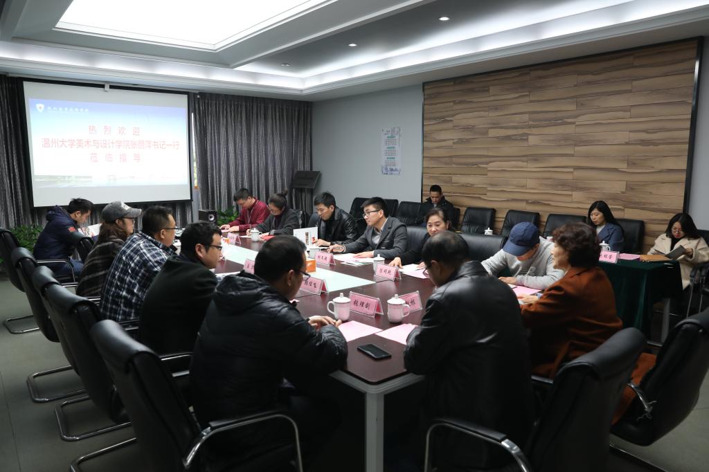 随后,双方在动漫游戏学院4307会议室进行了座谈交流。张丽萍、杨振海、胡文超等分别介绍了温州大学以及美术与设计学院创新创业教育改革情况,温大创新创业教育改革与研究工作一直走在全国前列,很多经验做法非常值得我校学习和借鉴。随后,荣先林和施丽娜分别介绍了动漫游戏学院的基本情况和动漫设计专业专创融合情况。张赵根介绍了我校的总体情况和“3334”创新创业教育模式改革情况。张丽萍一行对我校跨界融合办学理念和创新创业教育改革成效给予高度赞誉。最后双方就创新创业实践教学、众创空间建设和艺术设计类专业与创新创业教育融合等方面进行了交流探讨,并希望后期进一步加强两校间的合作与交流,共同推进创新创业教育改革取得更大成效。