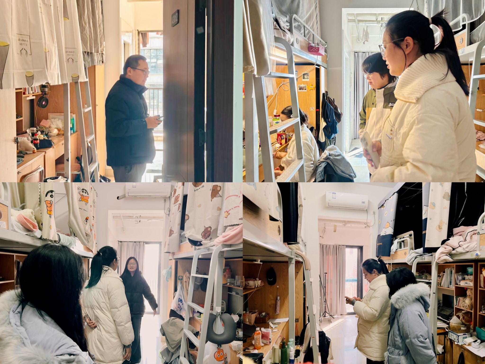 走访过程中,辅导员们针对冬季防火防盗、用电安全、出行防护等关键问题,提醒学生规范使用电器,杜绝违规用电,注意出行交通安全和人身财产安全,增强自我防护意识。辅导员们还与学生亲切交谈,询问大家的期末学习生活状况与假期安排,为学生缓解期末考试和就业实习压力,叮嘱大家通过有效途径做好自我调适,有必要的时候可以向学校求助。同时就假期离校关闭电源、锁好门窗等安全要点进行再次提醒。