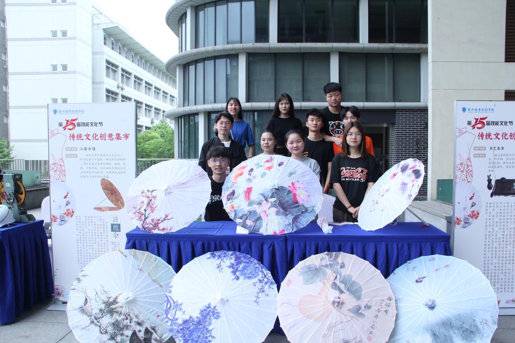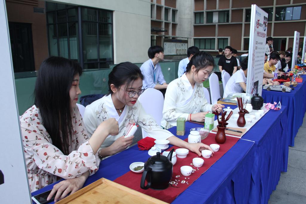 同学们积极参与,创意百出。我院师生结合茶艺表演和油纸伞展示,向来往观众生动演示了传统文化产品的艺术美。茶艺社凭借精致的茶具、娴熟的技艺、优雅的动作给现场观众留下深刻印象。行人走过,茶有余香,茶与茶道精神随风潜入往来人群心底。西湖油纸伞的“前世今生”与民俗风情同样引起参观者的浓厚兴趣,从“鲁班造伞”到伞的美好寓意,再到“纳采”、“纳征”中纸伞的功能,无一不展示着中国伞文化在滚滚历史长河中辉煌的历程……浓浓的江南伞情与宁静淡泊的茶文化相结合,让师生在驻足倾听中就能深深感受到传统文化的静与美。