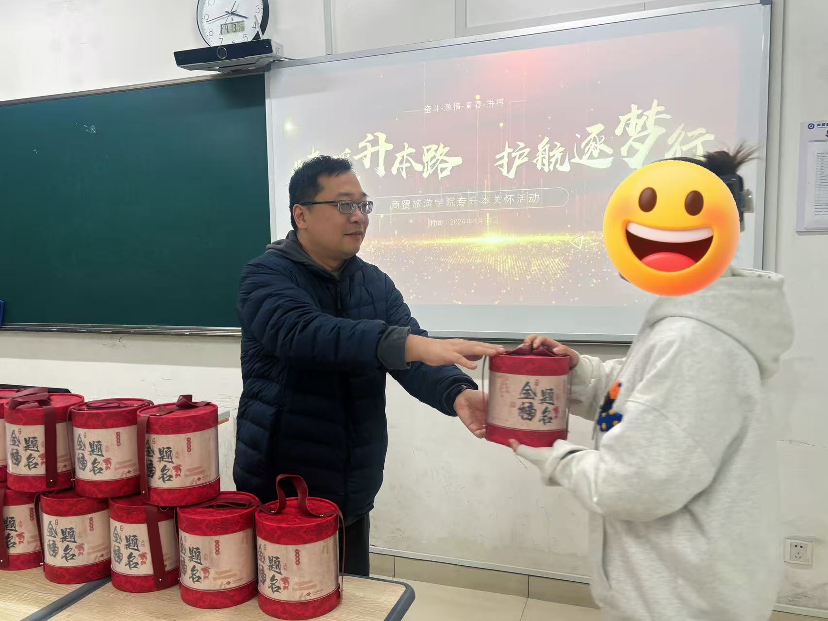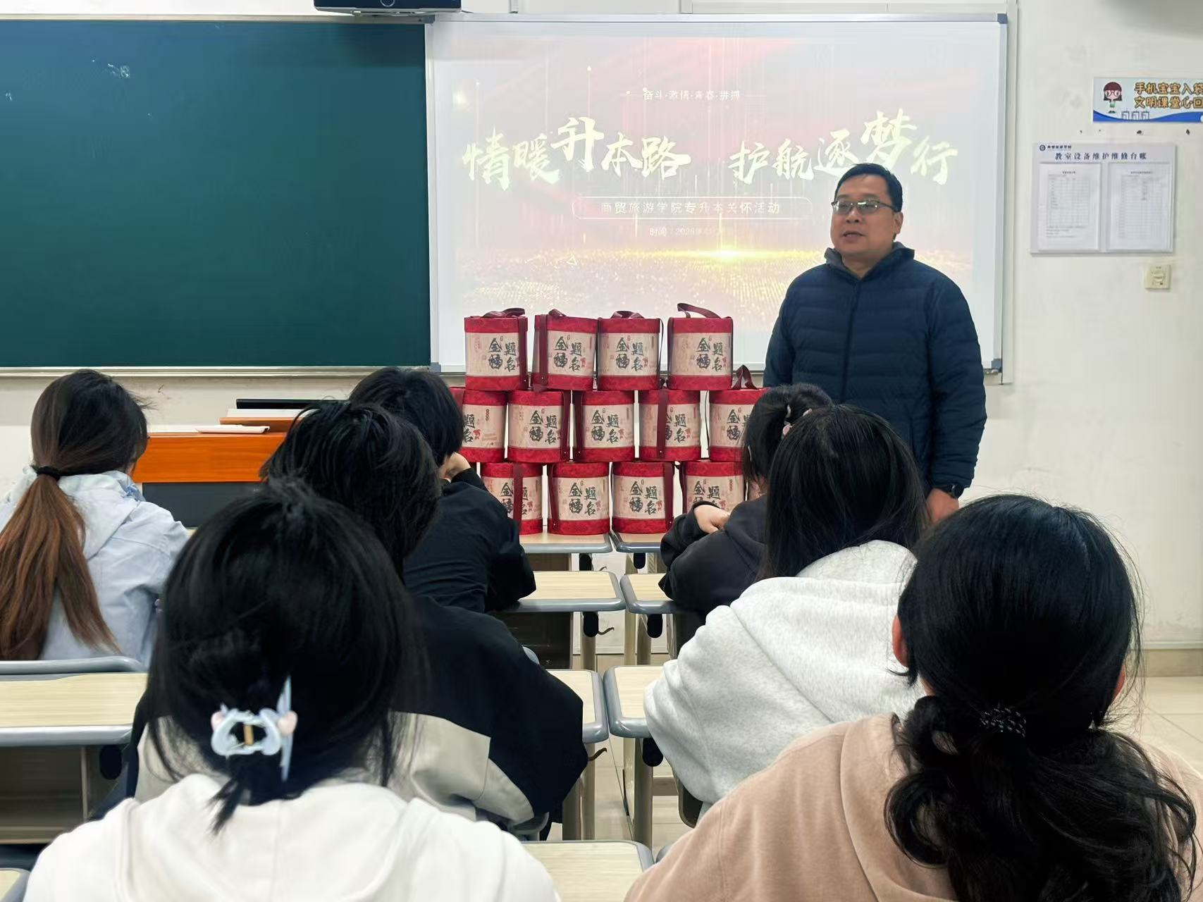 四月的校园,绿意葱茏,专升本考试已然进入最后冲刺阶段。为切实缓解家庭经济困难学生的备考压力,传递学院的人文关怀,商贸旅游学院于4月13日下午在8213教室开展“情暖升本路 护航逐梦行”考生送温暖活动。本次活动面向分院报名专升本的家庭经济困难学生,商贸学工办主任王晓磊、辅导员李剑桥到场,为学子们加油鼓劲、助力圆梦。