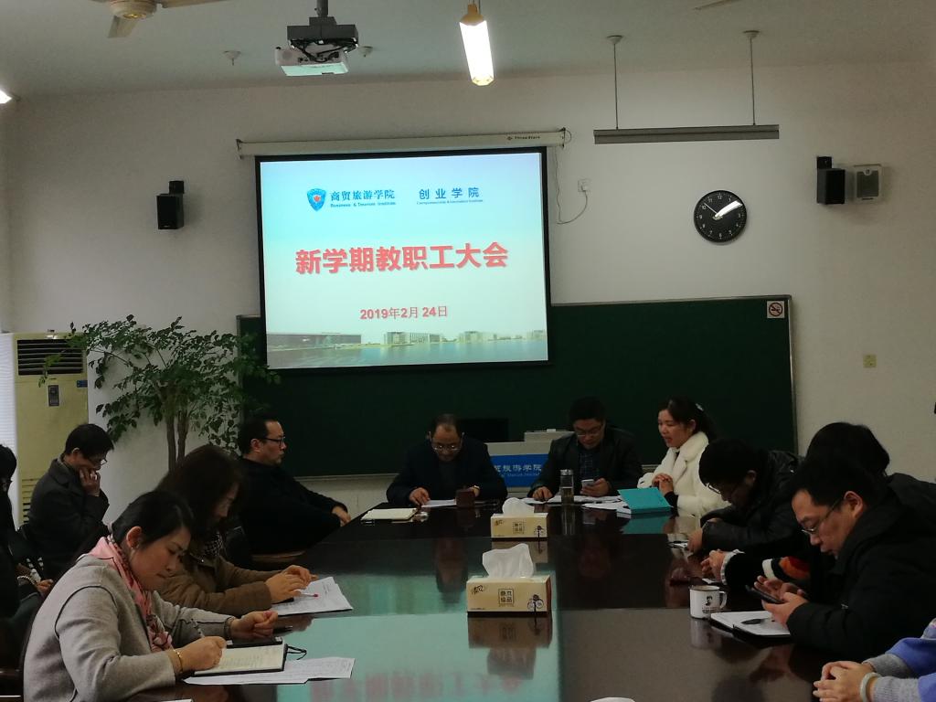 新学期,新要求,新作为。商贸旅游学院、创业学院开学前组织召开了分院中层干部研讨会,教科办、学工办等部门提前到校做好教学实训设备检查调试、期初补考和教学安排、学生报到准备等各项工作。开学第一天,各专业组分别组织召开专题教研活动,确保上好“新学期第一课”。2月24日下午,分院在8318会议室召开全体教职工学习教育会议,传达学习学校期初中层干部会议精神,部署推进新学期重点工作。院长张赵根、党总支书记姜萌、副院长戴凤微、创业学院副院长张理剑和全体教职工参加会议。
