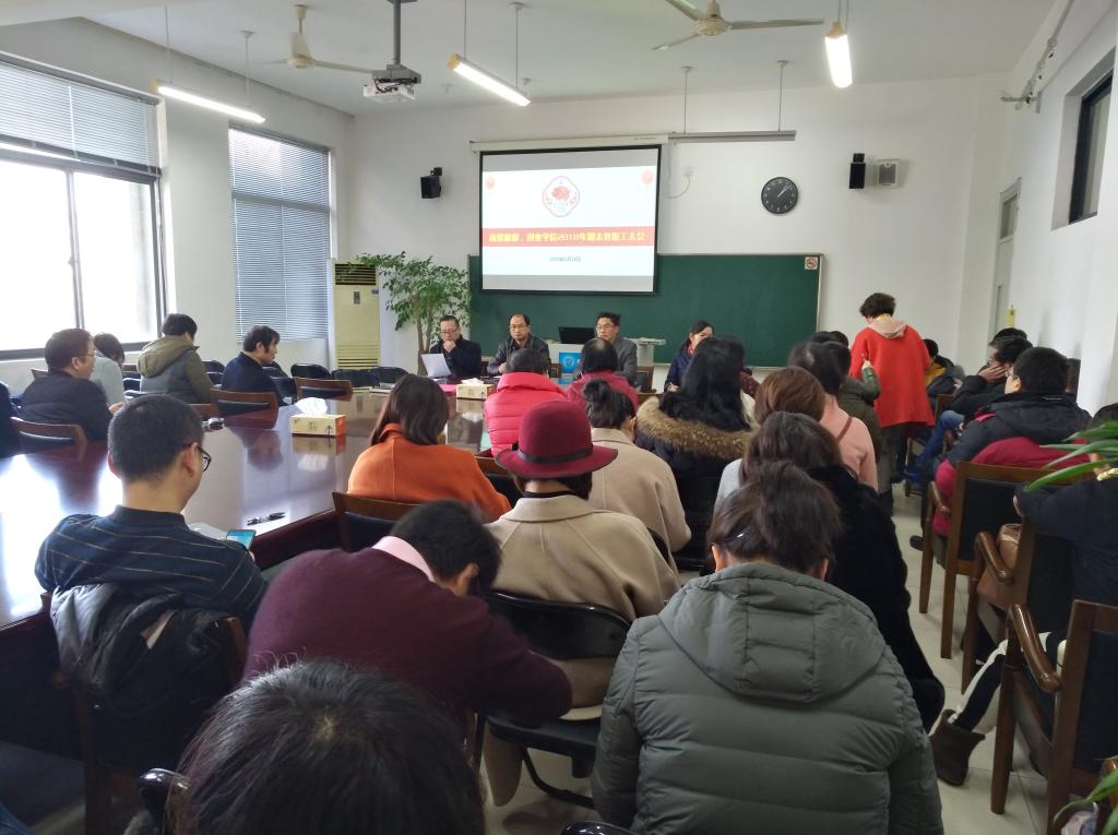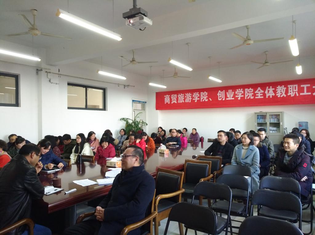 1月18日下午,商贸旅游学院、创业学院期末教职工大会在8318会议室召开,分院院长张赵根、党总支书记姜萌、副院长戴凤微、创业学院副院长张理剑和全体教职工参加大会。