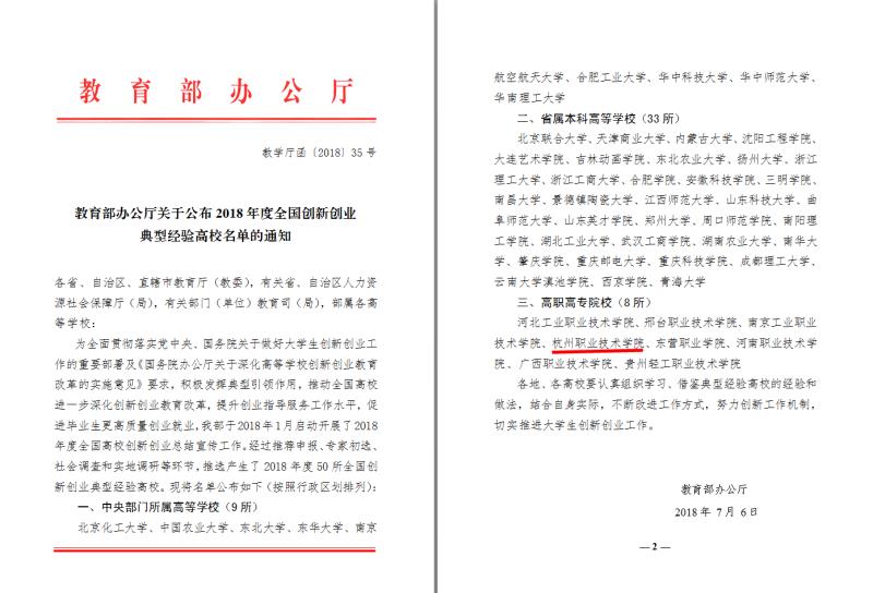 近日,教育部公布了“2018全国高校创新创业50强”名单。浙江省三所高校入选,杭州职业技术学院成为入选的全国8所高职高专院校之一,也是我省唯一入选的高职院校。这是杭职院继2016年“高职院校创新创业示范校”等创新创业教育工作荣誉之后的又一国家级殊荣。
