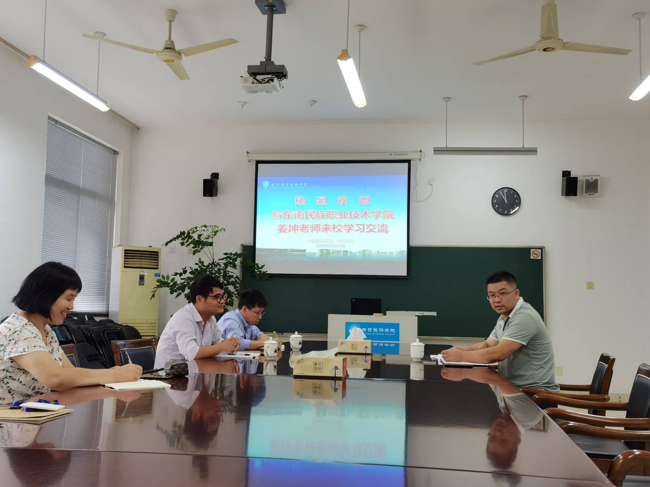 欢迎会上电商专业为姜坤老师确立了两位指导师傅---孙丽老师和白秀艳老师,并介绍了我校基本情况和电商专业的设置情况。商贸旅游学院作为我校最大学院,拥有学生2300多人,教职工77名,共计6个专业,其中专业教师55名。作为入选首批国家级职业教育教师教学创新团队的9所院校之一,我校电子商务专业主要通过岗位工作室开展专业实践教学。姜坤老师也就黔东南职业技术学院的情况进行了介绍,黔东南职业技术学院的电子商务专业隶属于旅游与商务管理系,共有7名专任教师,其中有4位90后,队伍很年轻有活力。作为电商专业的老师,他特别期待这次来杭州职业技术学院的学习机会,希望能跟着学生上课,从而更好地学习杭职院的教学模式,回去为专业建设输入新鲜血液。