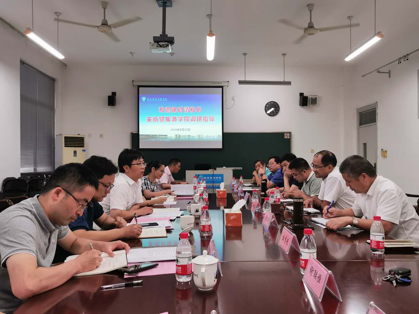 8月10日下午,徐时清校长深入商贸旅游学院,调研分院建设情况,并与分院领导班子、中层干部和专业负责人座谈交流。党政办、发展研究中心、人事处、专业建设指导处、财务处、学工部等部门负责人陪同调研。