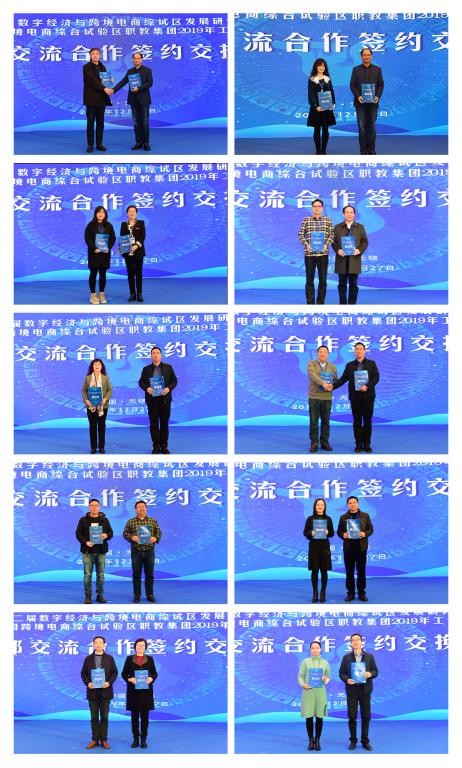 会议举行了职教集团系列项目启动仪式。由全国电商行指委牵头,职教集团和博导股份联合全国数十家优质院校,以及阿里巴巴、考拉等跨境电商龙头企业共同组织编写的首套“行业+领先企业”产教融合跨境电商系列教材正式发布;发布了职教集团《校际管理干部互派挂职锻炼管理办法》《成员学校教师互派交流管理办法》《成员学校学生互换和学分互认管理办法》等制度文件,举行了职教集团首批18家东西部院校交流合作签约文本交换仪式,启动了英国朴茨茅斯大学海外交换生项目。