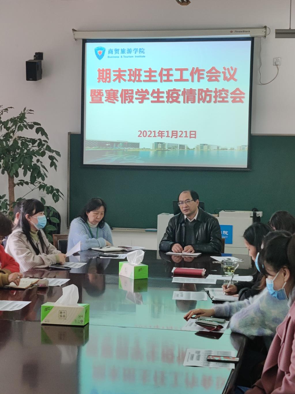为进一步夯实期末学生安全工作,落实学校学生疫情防控政策,1月21日,商贸旅游学院克服分院学生人数多,班级多的现实情况,分两场举行班主任工作会议,对疫情防控要求、学生安全教育管理进行再部署、再动员,分院党总支书记、院长张赵根、全体辅导员和班主任参加会议。