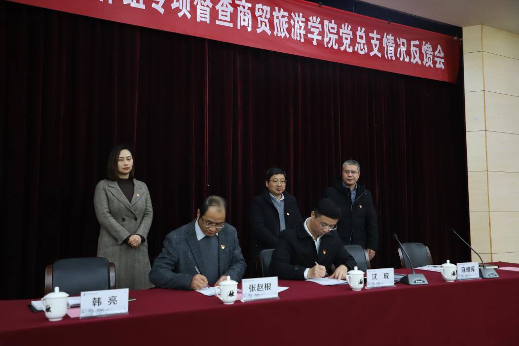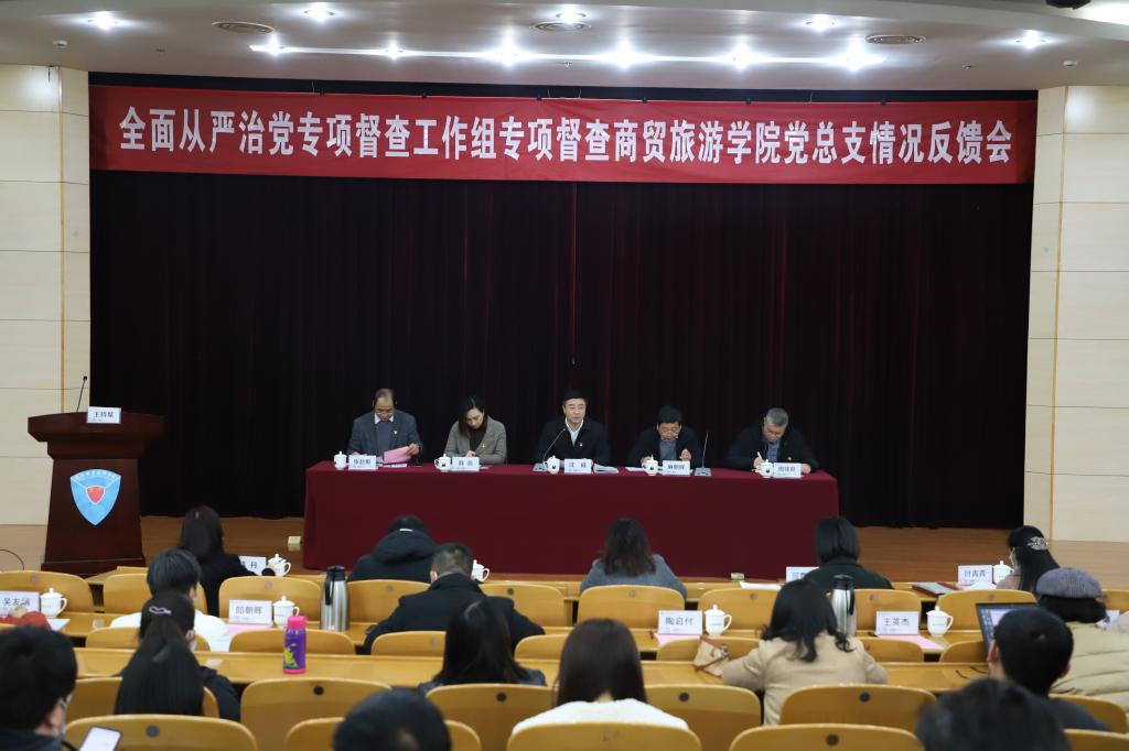 1月19日,学校全面从严治党专项督查工作组召开专项督查商贸旅游学院党总支情况反馈会,校纪委书记、专项督查组组长沈威和专项督查组全体成员出席会议。会议由商贸旅游学院党总支书记、院长张赵根主持,商贸旅游学院全体教职工参加会议。