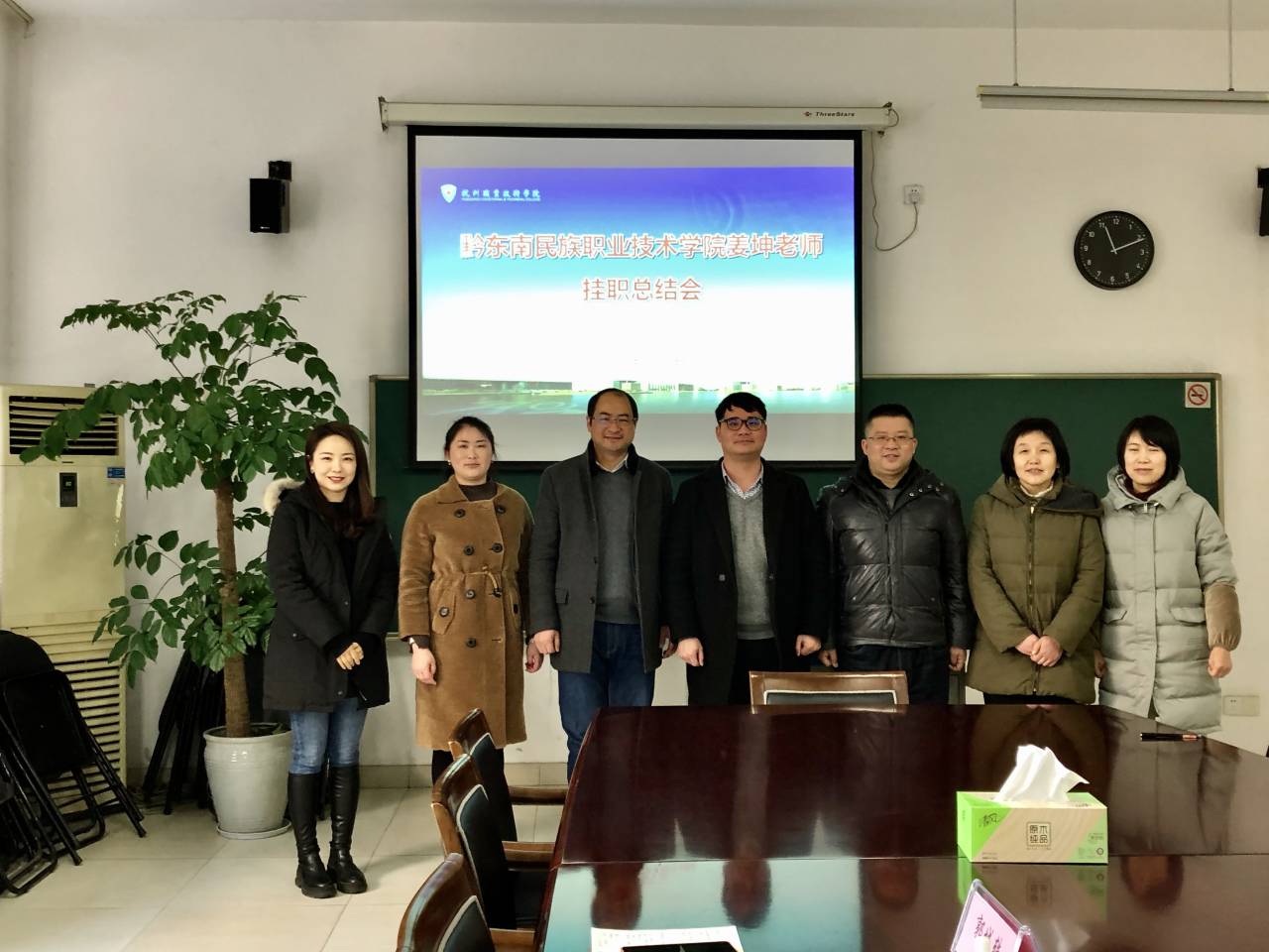 本学期初开始,黔东南职业技术学院姜坤老师在商贸旅游学院进行为期一学期的挂职工作。现期末已至,姜坤老师的挂职锻炼即将结束。1月12日上午,商贸旅游学院在8318会议室召开了黔东南教师挂职工作总结暨欢送会。分院党总支书记、院长张赵根,副院长袁江军、综合办和教科办负责人及电商专业相关老师参加会议。
