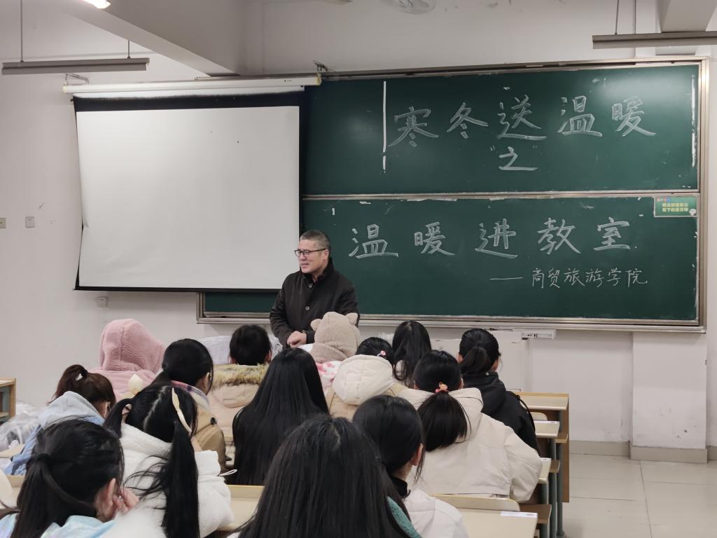 12月14日,一场大规模的寒潮侵袭江南,气温骤降。正当严冬来临,寒意渐浓之时,商贸旅游学院在8202教室开展“温暖进教室”活动,暖意十足。商贸旅游学院党总支副书记周佳良、学工办王晓磊、陈玉燕和60名受资助学生参加了活动。