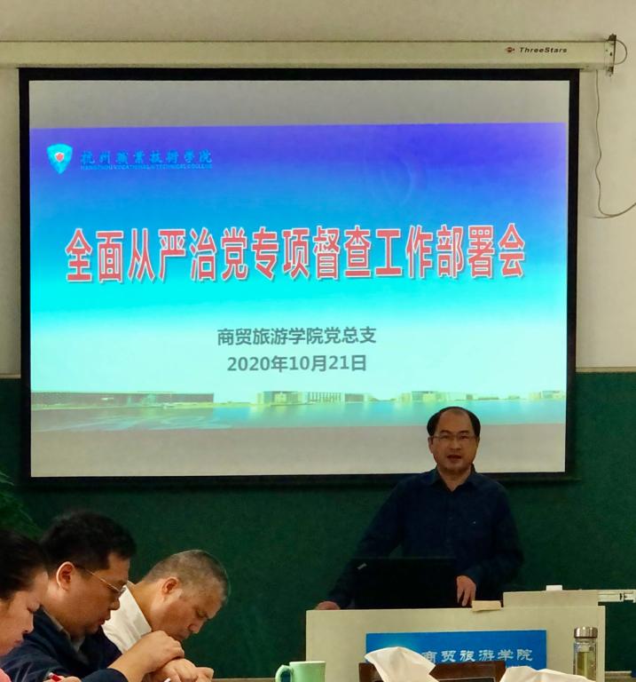 为配合做好校党委全面从严治党专项督查工作,10月21日上午,商贸旅游学院党总支书记、院长张赵根在8318会议室召集召开了分院关于迎接2020年全面从严治党专项督查工作部署会,分院全体班子成员、全体中层干部、 各支部书记及各专业负责人参加会议,会议由张赵根主持。
