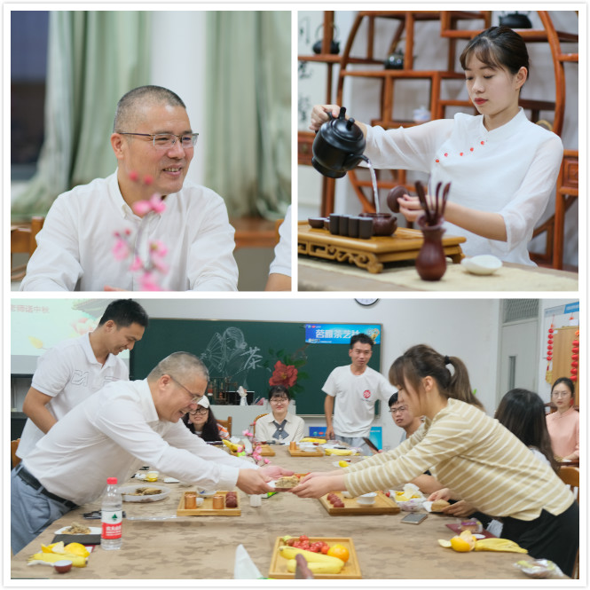 当中秋遇上国庆,便是家国共团圆。9月28日晚上,商贸旅游学院8号楼6楼灯火通明,喜气洋洋。商贸旅游学院党总支副书记周佳良、学工办老师、返校校友和在校学生代表欢聚一堂,品茶赏月共度双节。